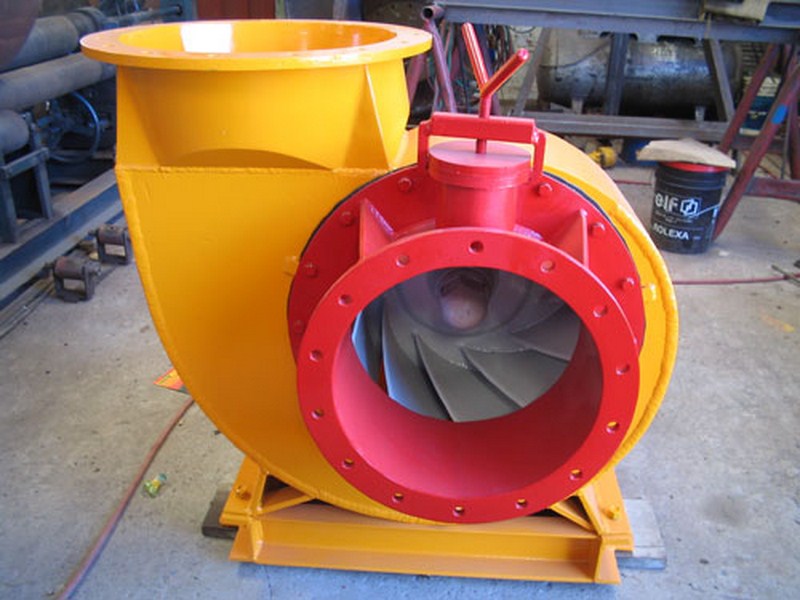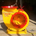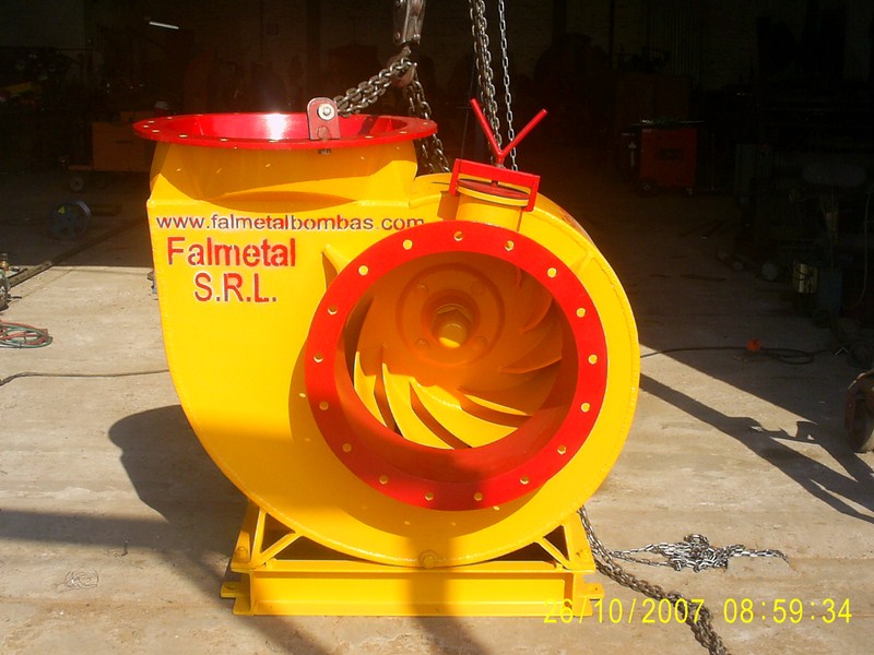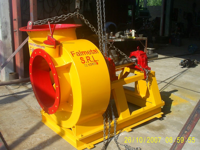 Diámetro de turbina 495 mm, de 10 paletas de 3/8” de espesor en forma helicoidal recta, fondo de turbina en chapa de 5/8” con una masa central cónica con chavetero de 5/8” totalmente balanceado y centrado. Con soldadura especial. Revestimiento en corte Alavés soldado con electrodos especiales Anti Desgaste (Electrodo Especial 600 S alto impacto)