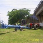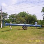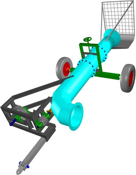 En la parte media de la bomba se instala un marco de hierro ángulo con un eje transversal para 2 ruedas de 6,5″ x 16″, las cuales sirven de apoyo y traslado, este sistema consta de una rosca de 1. 1/4″ para regular la altura de la tobera de succión a fin de adaptar a la condición más optima del ambiente de operación.
